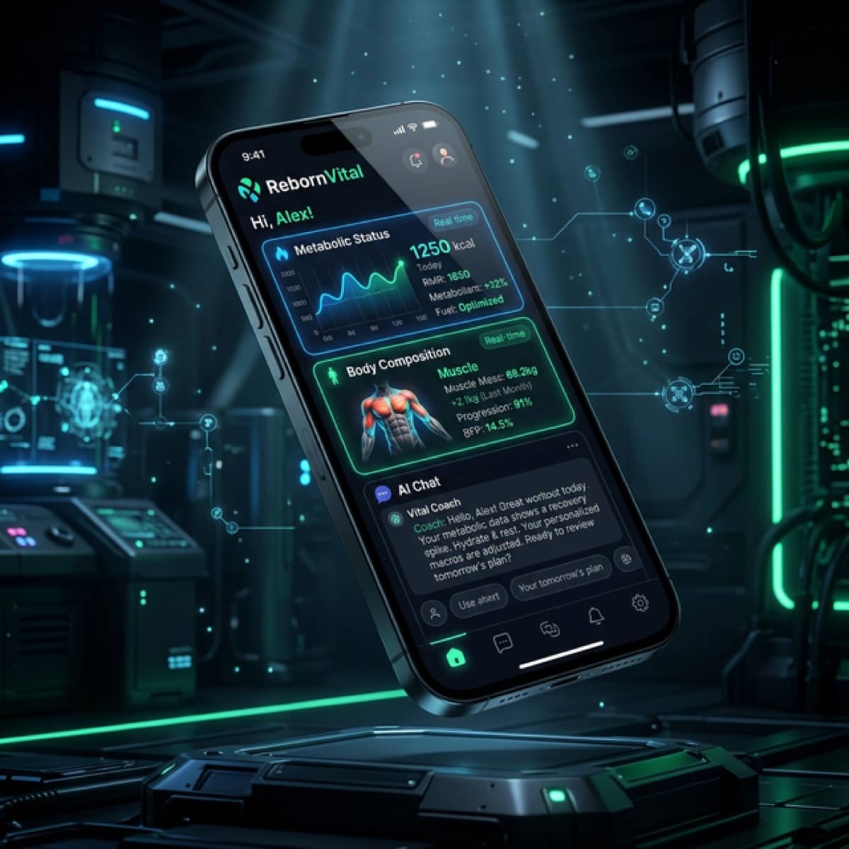 Unlike static calorie counters, RebornVital uses a dynamic Metabolic Engine. It analyzes your sleep, stress, and activity in real-time to adjust your targets. If you're tired, it suggests recovery; if you're peaking, it pushes you. It's like having a world-class coach in your pocket 24/7.